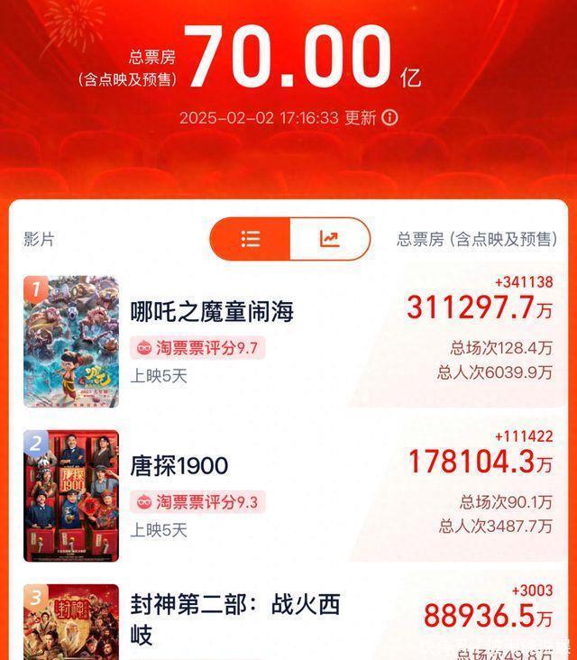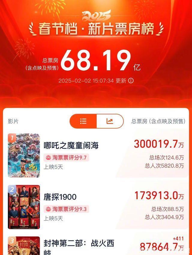《哪吒之魔童闹海》《唐探1900》 《封神第二部:战火西岐》 分列春节档票房榜前三位 其中,《哪吒之魔童闹海》票房突破30亿